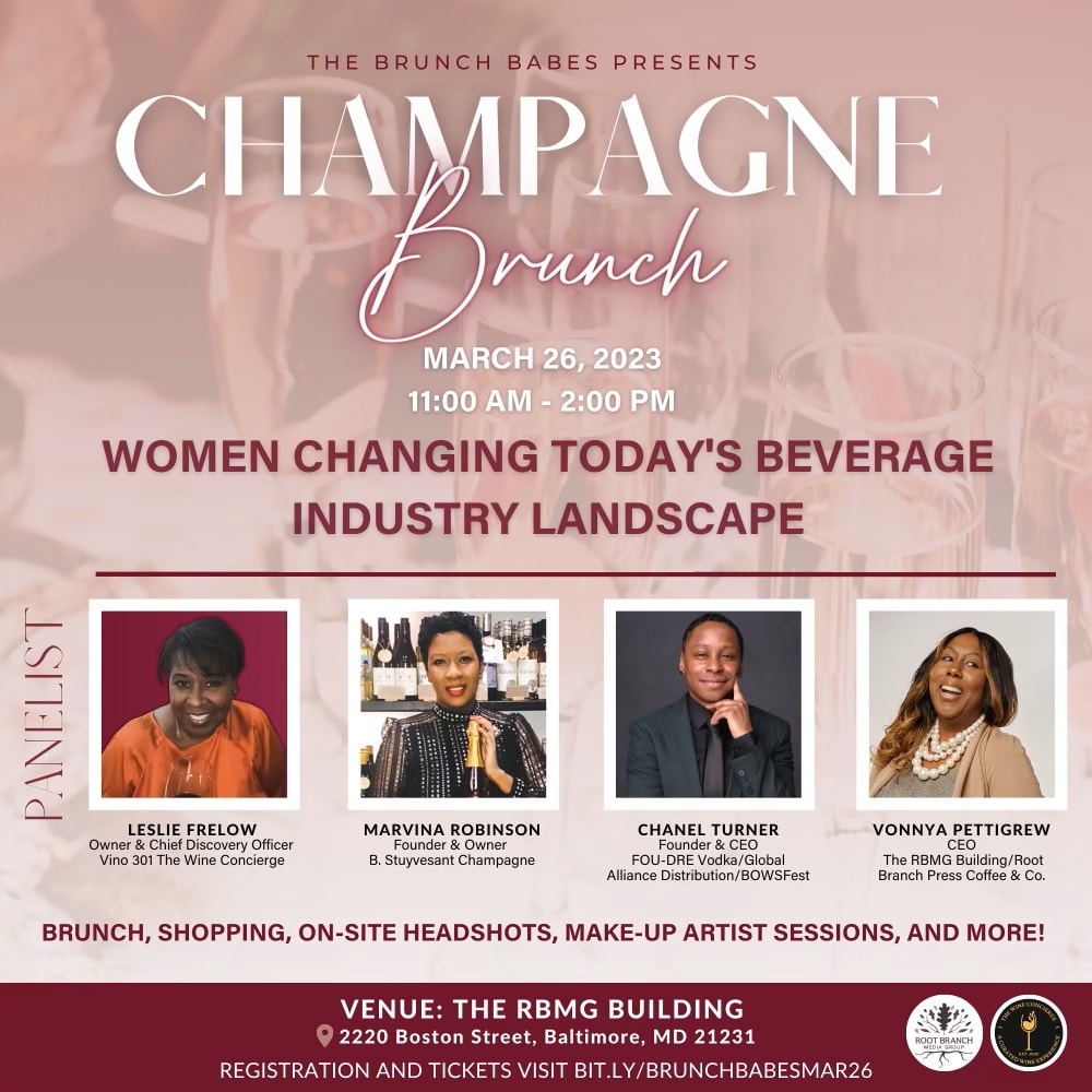 Toast to Women’s History Month with the Brunch Babes! 🥂✨ Join us on March 26, 2023, for a Champagne Brunch and Panel Discussion on "Women Changing Today's Beverage Industry Landscape." Our panelists, including Marvina Robinson, @stuyvesantchampagne Founder & Owner, Chanel Turner, @foudrevodka Founder & Owner, and Vonnya Pettigrew, @buildingrbmg @rootbranchmg and @rbpresscoffeeco, are powerful boss women who have made their mark in the industry. You will hear from our amazing panelists and have the opportunity to shop from vendors, get one-on-one makeup artist sessions, and capture your look with on-site headshots. Come sip, savor, slay, talk shop, and elevate your brand over a bubbly brunch at The RBMG Building. We can't wait to see you there!
