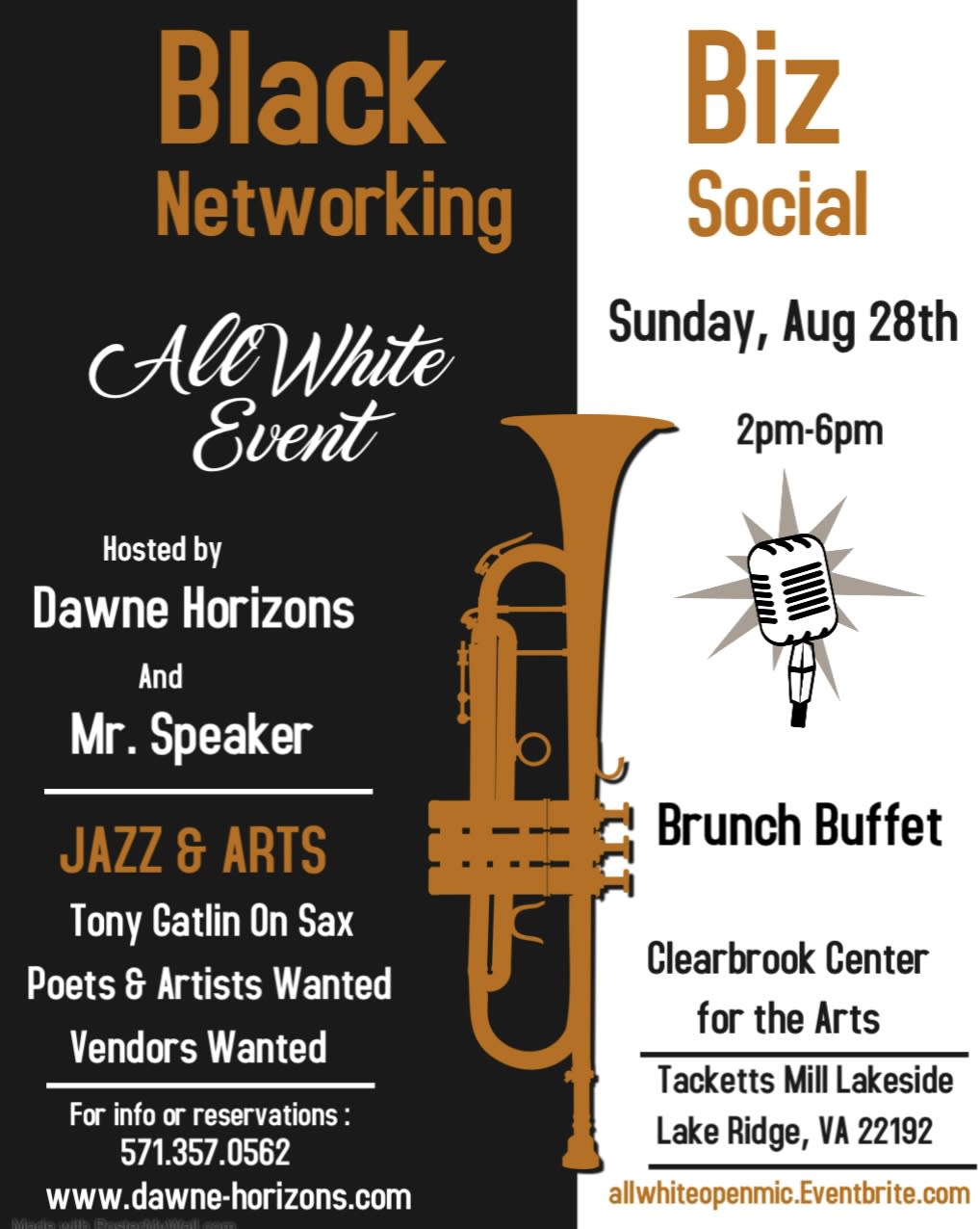 This event is the kickoff and relaunch of the Black Business Networking Social Events hosted by Poet & Host, Dawne Horizons and Co-Host: Poet, James "Mr. Speaker" Sears What you can expect: Several Black Owned Biz's from the DC, MD & VA areas. Arts & Entertainment including Poets, Comedians, Musicians, Actors and Artists. Good Food. Good People and a Great Time at a Great price. *Artists & Vendors contact Dawne 571-357-0562 Text your Biz Card, Email & Website. If you're an MLM Business you will have exclusivity to one per company or industry. First Come, First Serve. CLICK HERE FOR TICKETS FOR EVENTBRITE