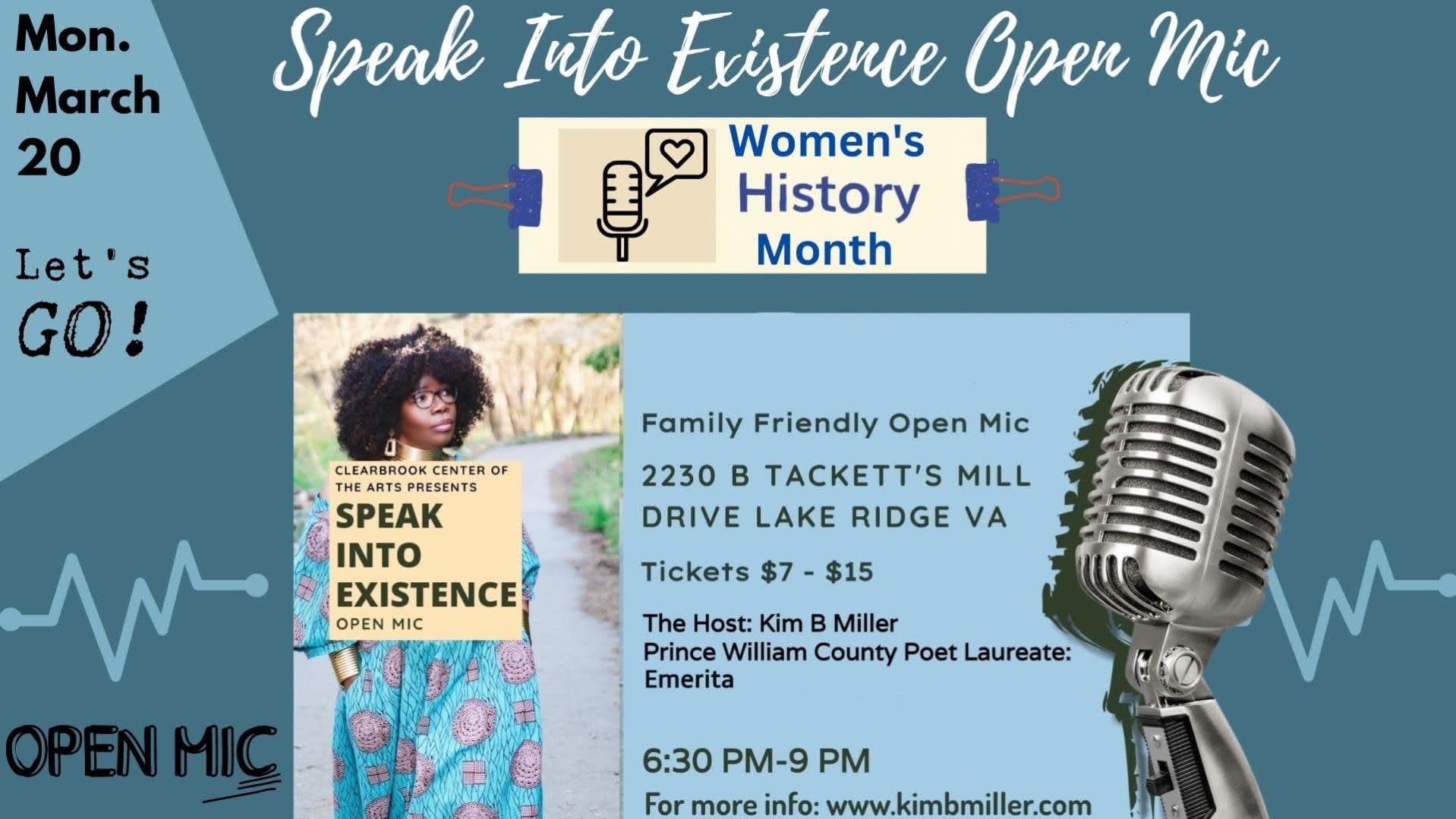 **Everyone is welcome to perform.** Happy Women's History Month! Join us for a powerful *family friendly* open mic, in Prince William County, VA on Monday, March 20. Performers: If you would like to, tell us about a historic woman: it could be you, someone in history or someone you brought with you to brag on.... Poets, musicians, writers, spoken word poets, comedians, singers, rappers, story tellers and public speakers...**Everyone is welcome to perform.** Your haiku host is Kim B Miller. Kim is the first (and only) African American Poet Laureate for Prince William County, Manassas & Manassas Park, VA. Kim is an award winning poet. This location is wheel chair accessible and the event takes place on the first (main) level. For those who are hearing impaired we can suggest an app for your Android that will translate and type the words visibly to your phone. Don't miss this! Free parking! **No refunds. All ticket sales are final!** Special thank you to John Wooten and the Clearbrook Center of the Arts for having this event.