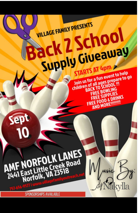 The Village Family & Partners Annual Back to School Expo will be held Saturday, September 10th , 2022 at AMF Norfolk Lanes 2441East Little Creek Road in Norfolk, Virginia. At this event, students and families receive free school supplies, enjoy free food, entertainment, outreach referral resources and a whole lot more. Sponsors are needed for this Back to School community outreach event. Our goal is to give away school supplies to over 300 K-12 students in the Norfolk area. Many children served at this event, have little or no means to return to school with the proper nutritious meals and school supplies needed. We want to help the children feel comfortable going back to school. Your donations will be used to pay for venue costs, school supplies, technology rentals, food expenses, and essentials needed to keep our guests safe Please consider at what level you will sponsor the event this year. Thank you for your continued support. "It Still Takes A Village" ✨✨Visit Learn more, Partner and Donate Today http://www.villagefamilyoutreach.net ✨✨Village Family volunteer opportunities at http://www.volunteerhr.org Thank you for your support