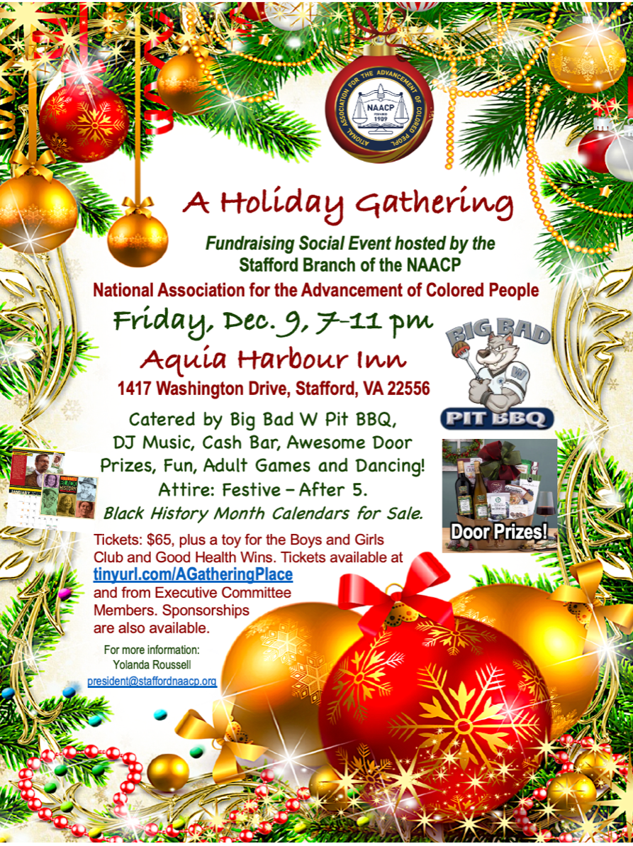 It's time to get festive and celebrate the season, so join us, the Stafford County NAACP, at our annual holiday social gathering. This year we're calling it "A Gathering Place," and it will take place 7-11 pm on Friday, Dec. 9, at the Aquia Harbour Inn, 1417 Washington Drive. Just like past years, guests will enjoy Great Food - Great Music - and Great Fun! This year features more wonderful prizes, giving every attendee a chance to WIN!!! Every year, you have been very generous honoring our request to bring a toy with you that will be donated to children in our community. As a matter of fact, this has become a tradition! So, once again, we are asking you to help us support the Boys and Girls Club and the NCNW Stafford/Fredericksburg Sect. Good Health Win organization by contributing to the toy drive. If clothing is what you would rather contribute, that is quite acceptable. Tickets for our event are $65, and they can be purchased here by clicking on the red "Get Tickets" button above, or you may contact any of our Executive Committee members, and they will be glad to sell you an actual souvenir printed ticket. Ticket sales end Dec. 6 at 7 pm. With the purchase of a ticket, you may choose your dinner entrée (Catered by Big Bad W Pit BBQ) from the following: • Bourbon Glazed Salmon dinner • Prime Rib dinner • Vegetarian Lasagna Also includes... DJ Music, Cash Bar, Awesome Door Prizes, Fun, Adult Games and Dancing! Attire: Festive – After 5. Black History Month Calendars for Sale. SPONSORS Your support as Sponsors will aid in our efforts to support the community and provide educational Town Hall meetings and free programs for the public. This time of year is when your support is very important to our efforts. Right now you are invited to take advantage of our advertising space to showcase your business, your organization, your family or an individual! Your business or organization can be recognized in our Holiday Social Souvenir Program booklet. The choices are: Platinum ........... $700 + Full page and 4 tickets to gala event Gold................... $500 + 1/2 page and 2 tickets to gala event Silver.................. $300 + 1/4 page and 1 ticket to gala event Donation............. $50 + Acknowledgment in the Souvenir Booklet Silver, Gold and Platinum will also receive a beautiful Certificate of Appreciation from the Stafford NAACP. For more information regarding sponsorships, please contact the Stafford NAACP President at president@staffordnaacp.org. Sponsorship deadline is Dec. 2 at 7 pm. Thank you so much for your support in the past. If this will be your first time -- come out and join us for a fun, delicious and enchanted evening!!! We truly appreciate your interest and your generosity in the past. We look forward to seeing you at our next event!!! CLICK HERE FOR TICKETS FOR EVENTBRITE