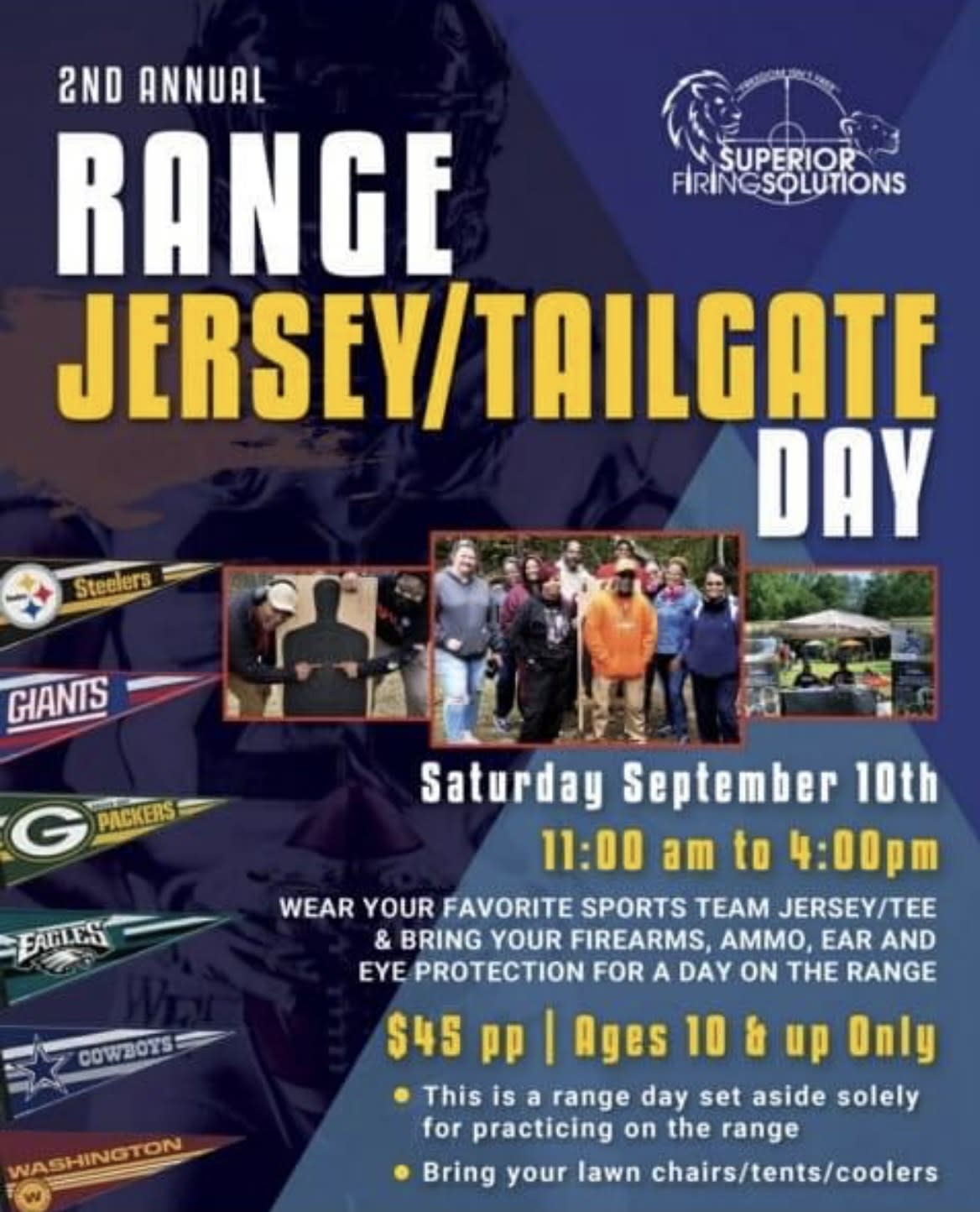 Come rep your squad in your favorite jersey or T-shirt. Bring your firearms, ammo, and safety gear for an awesome day on the range. $45.00 per person ages 10 and up. it's a tailgate y'all so bring your tents lawn chairs. Food will be available for purchase (plates will be $5.00 w/ drink) extra drinks will be available for purchase. ammo will also be available for purchase .\