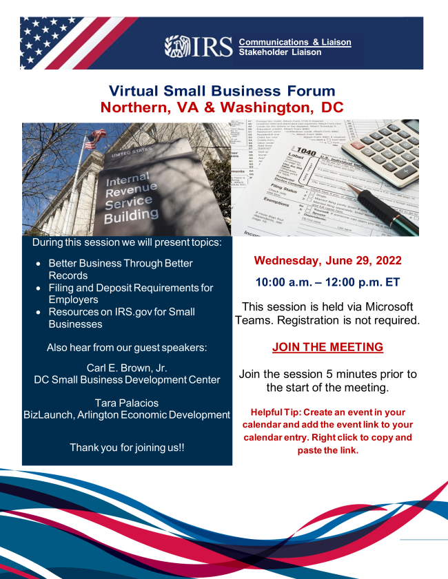 During this session we will present topics: Better Business Through Better Record Filing and Deposit Requirements for Employers Resources on IRS.gov tor Small Businesses Also hear from our guest speakers: Cart E. Brown, Jr. DC Small Business Development Center Tara Palacios BizLaunch, Arlington Economic Development